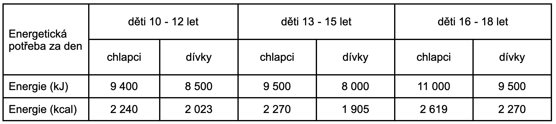Průměrná energetická potřeba nesportujících teenegerů: